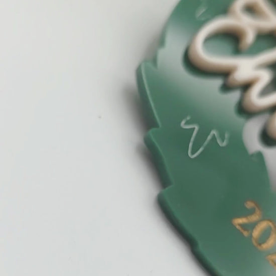 Each ornament is made from two layers of ⅛” acrylic, creating a dimensional, polished finish. The year is engraved and hand-painted in gold, adding an elegant shimmer that catches the holiday lights beautifully.