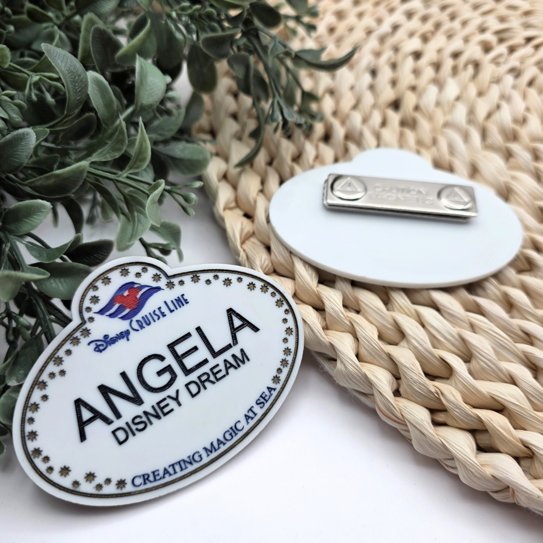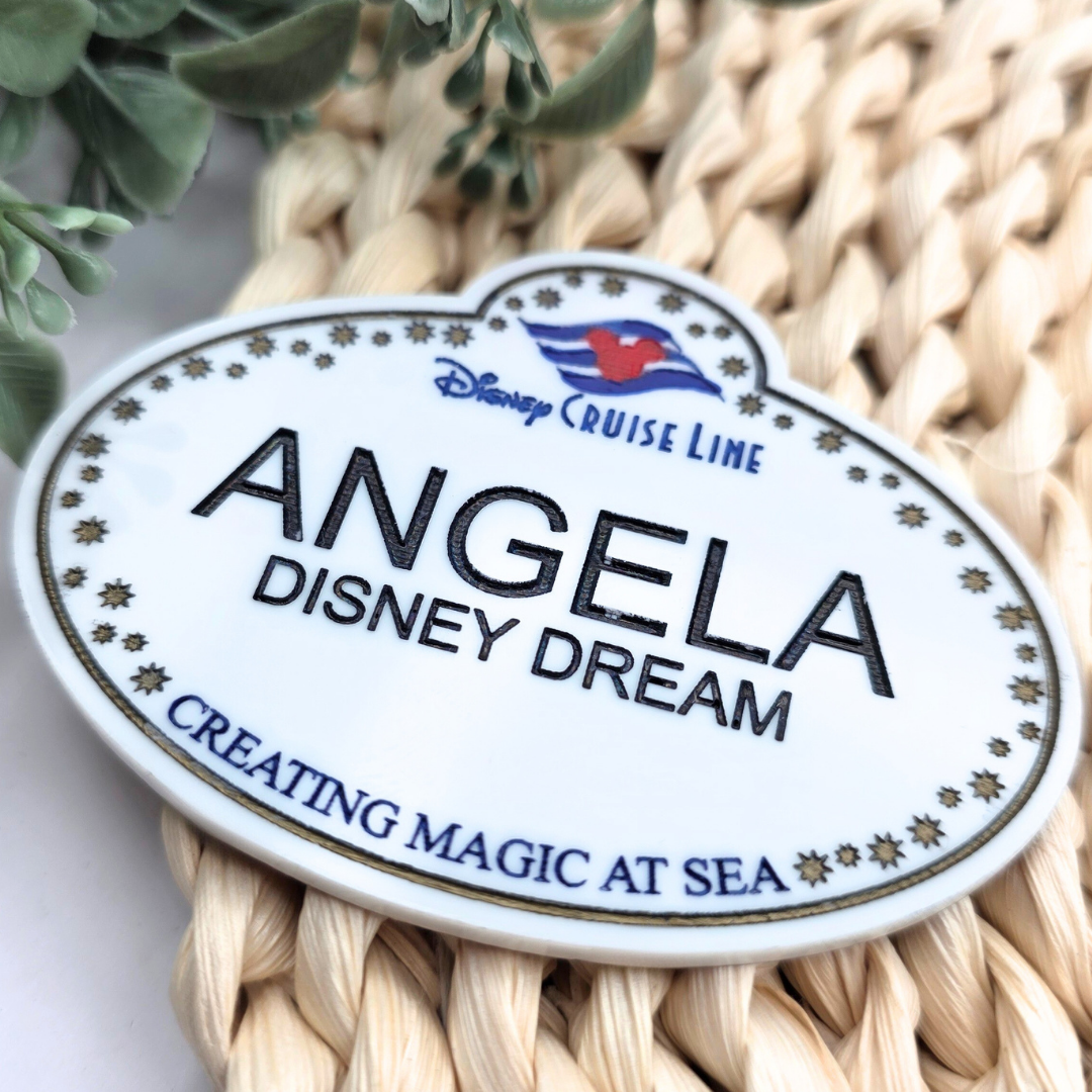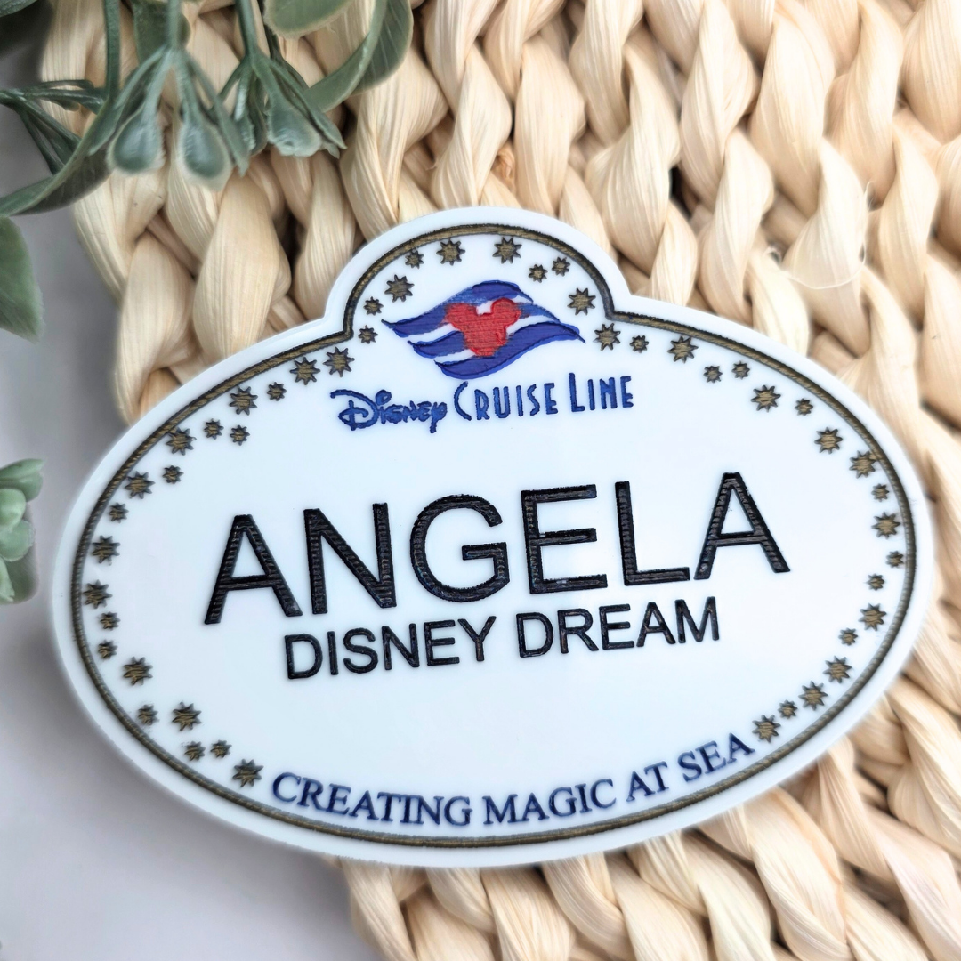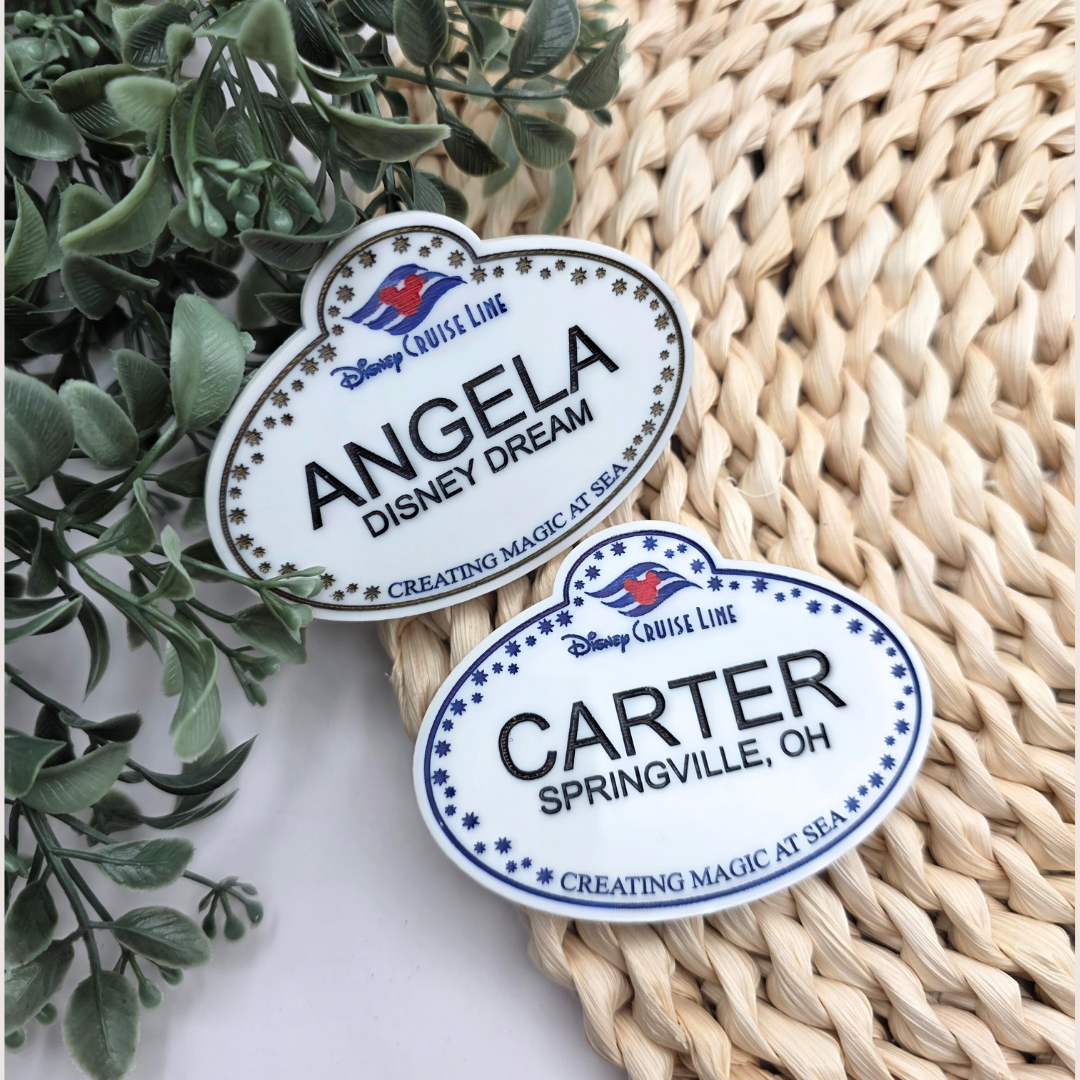Each badge is engraved on premium 1/8" acrylic, hand-painted for crisp detail, and framed with a whimsical star border in your choice of blue, silver, or gold. A magnet backing makes it easy to attach securely without damaging clothing, so it’s perfect for meet-and-greets, sail-away parties, or displaying in a shadow box after your trip.
