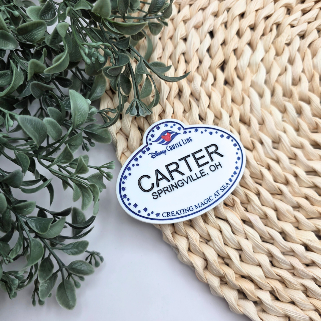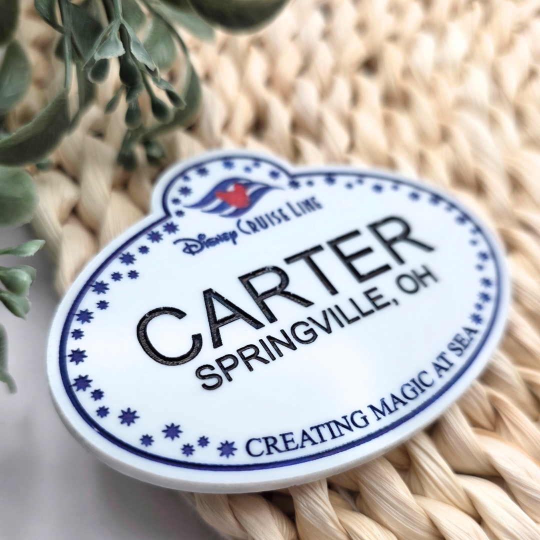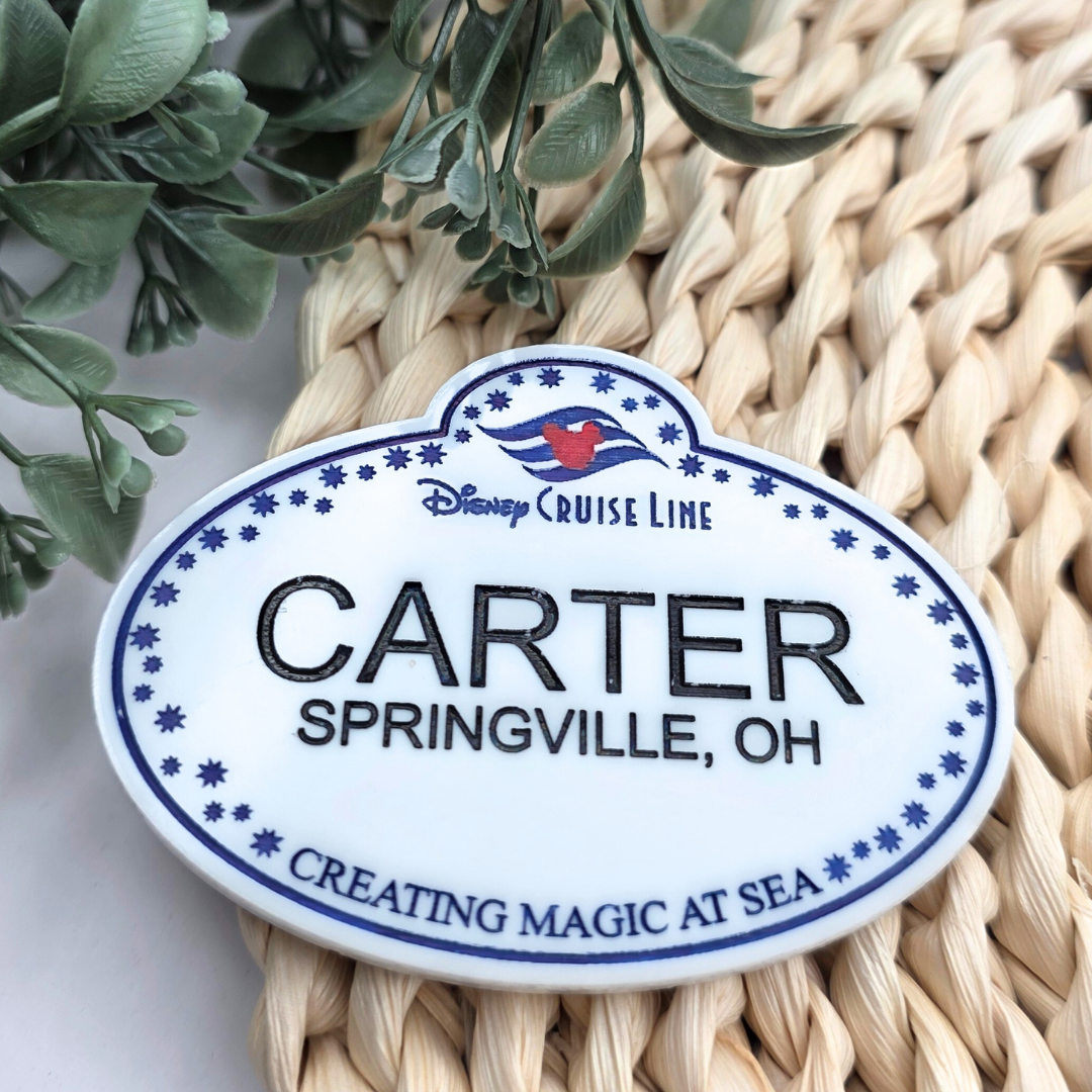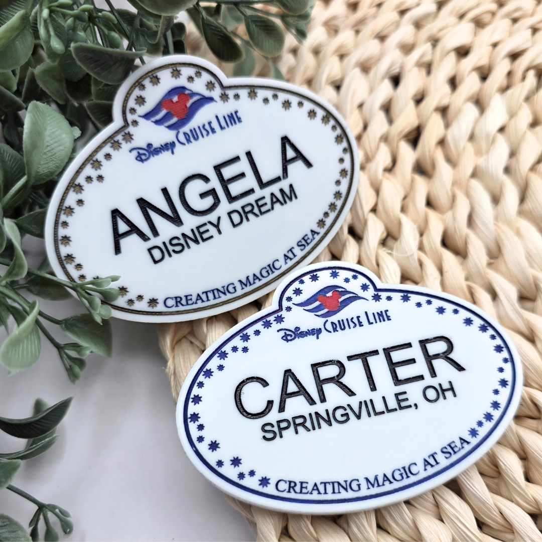 Each badge is engraved on premium 1/8" acrylic, hand-painted for crisp detail, and framed with a whimsical star border in your choice of blue, silver, or gold. A magnet backing makes it easy to attach securely without damaging clothing, so it’s perfect for meet-and-greets, sail-away parties, or displaying in a shadow box after your trip.